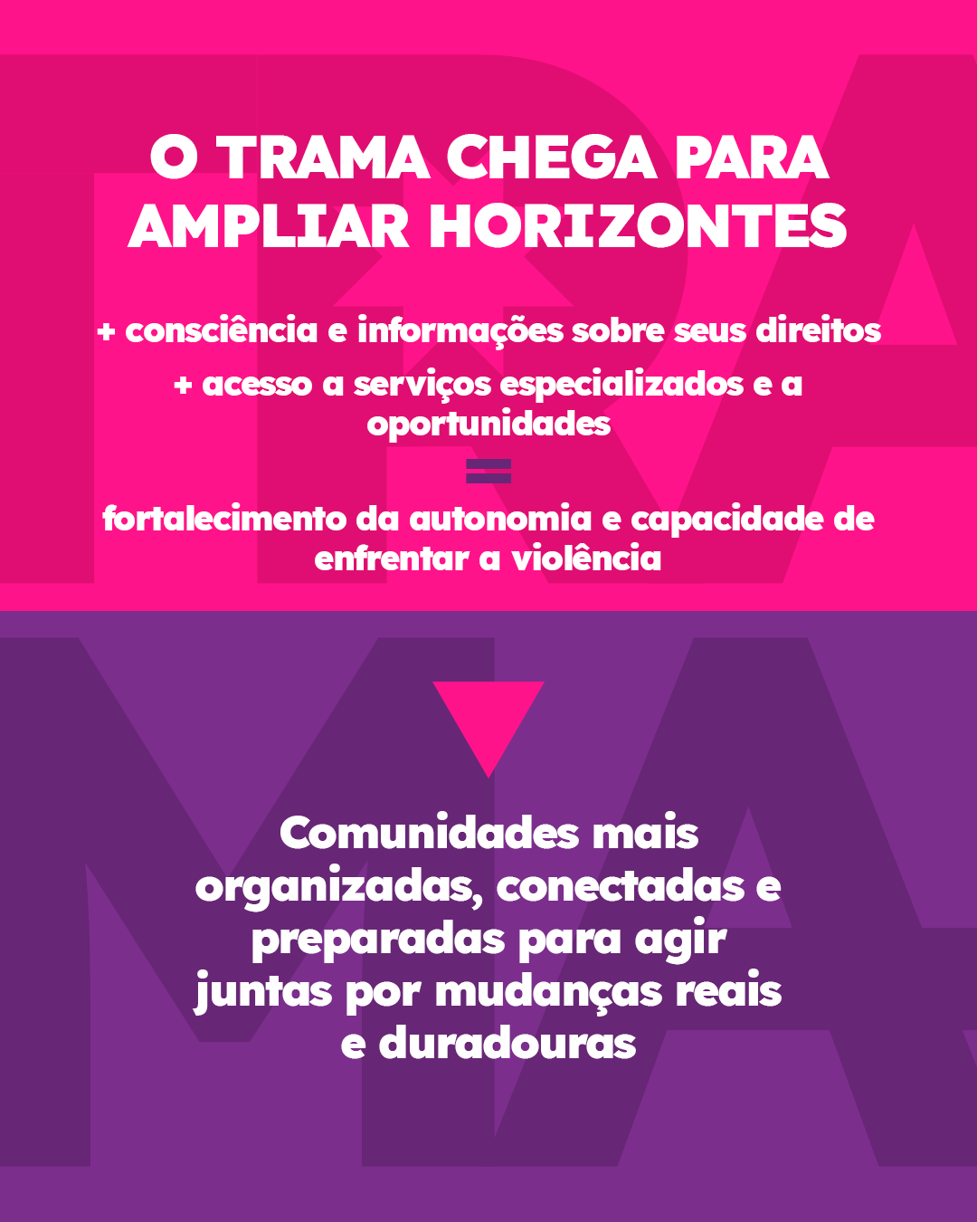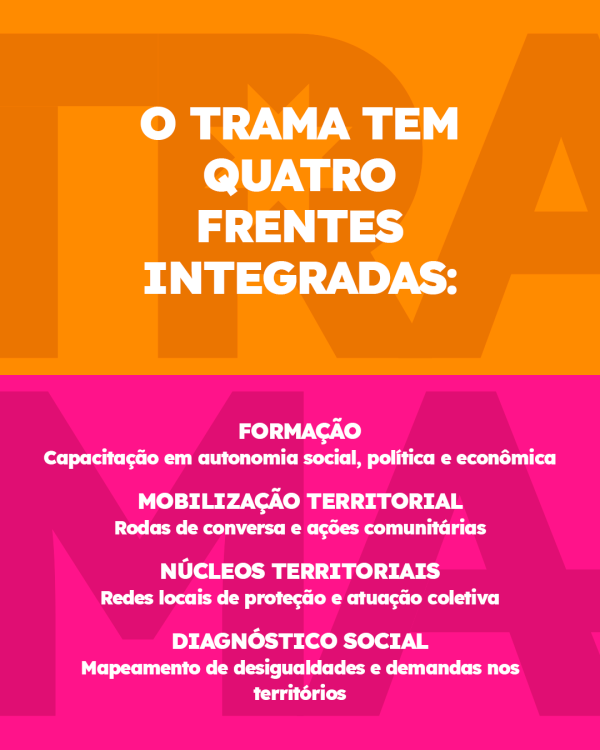 No TRAMA vamos atuar em quatro frentes integradas: formação de mulheres em autonomia social, política e econômica; mobilização territorial por meio de rodas de conversa e ações comunitárias; criação de núcleos territoriais de proteção e atuação coletiva; e diagnóstico social para mapeamento de desigualdades e demandas locais.